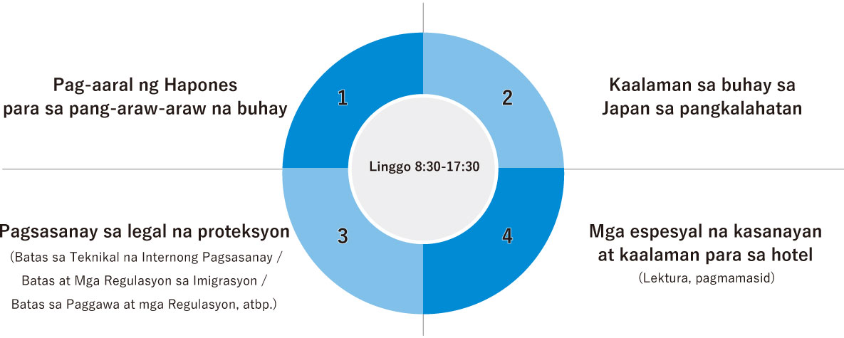 * Ang praktikal na pagsasanay (pagsasanay sa paglilinis ng silid gamit ang isang mock-up na silid, pagsasanay sa serbisyo, atbp.) ay isasagawa pagkatapos ng pagsasanay para sa mga bagong pasok.